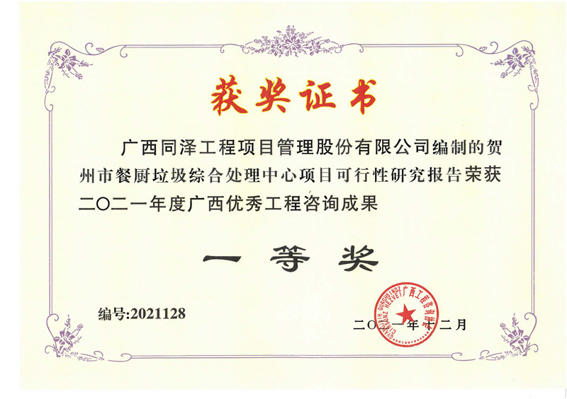 賀州市餐廚垃圾綜合處理中心項目榮獲2021年度廣西優(yōu)秀工程咨詢成果一等獎
