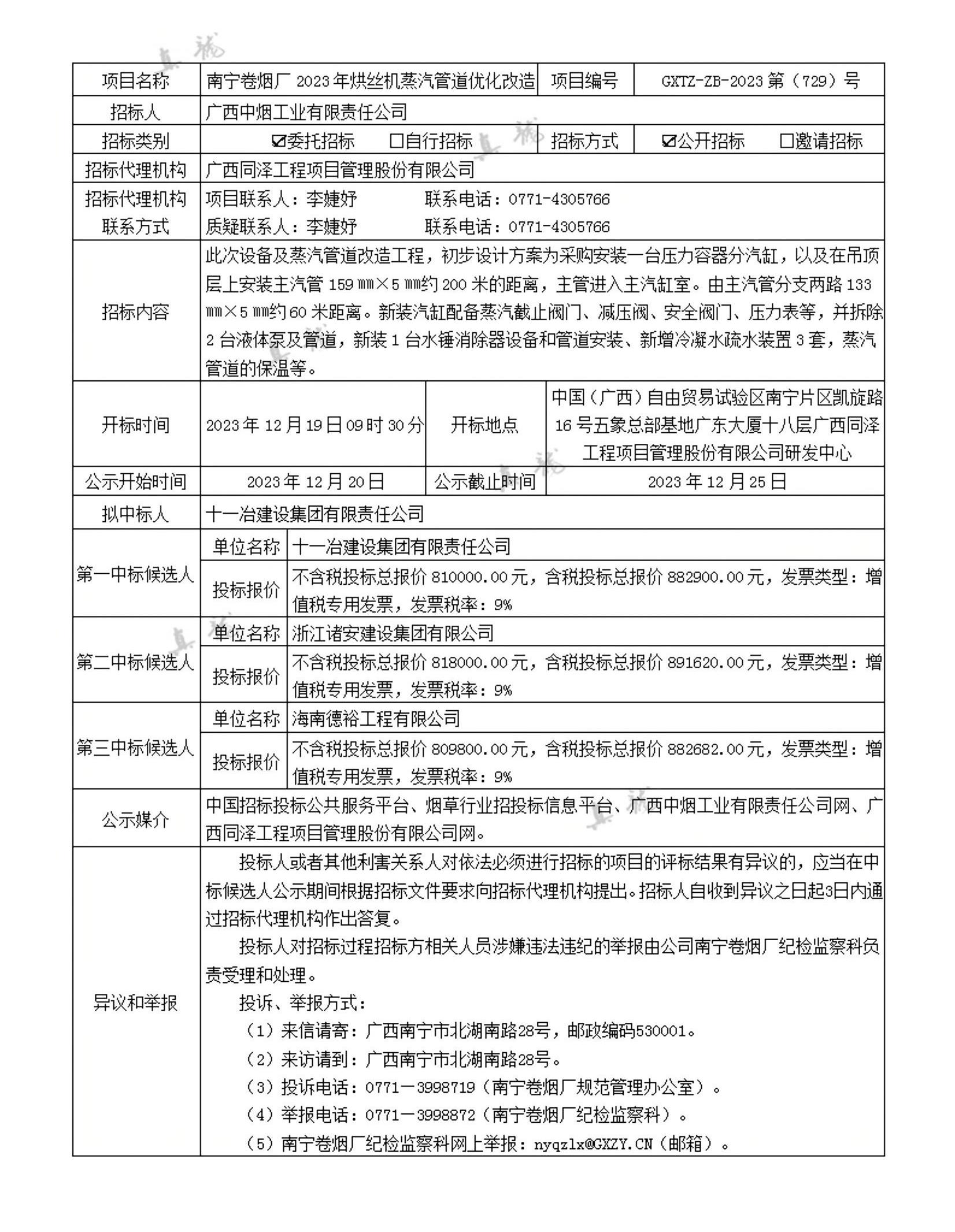 廣西中煙工業(yè)有限責(zé)任公司南寧卷煙廠2023年烘絲機蒸汽管道優(yōu)化改造(項目編號:GXTZ-ZB-2023第(729)號)中標(biāo)候選人公示