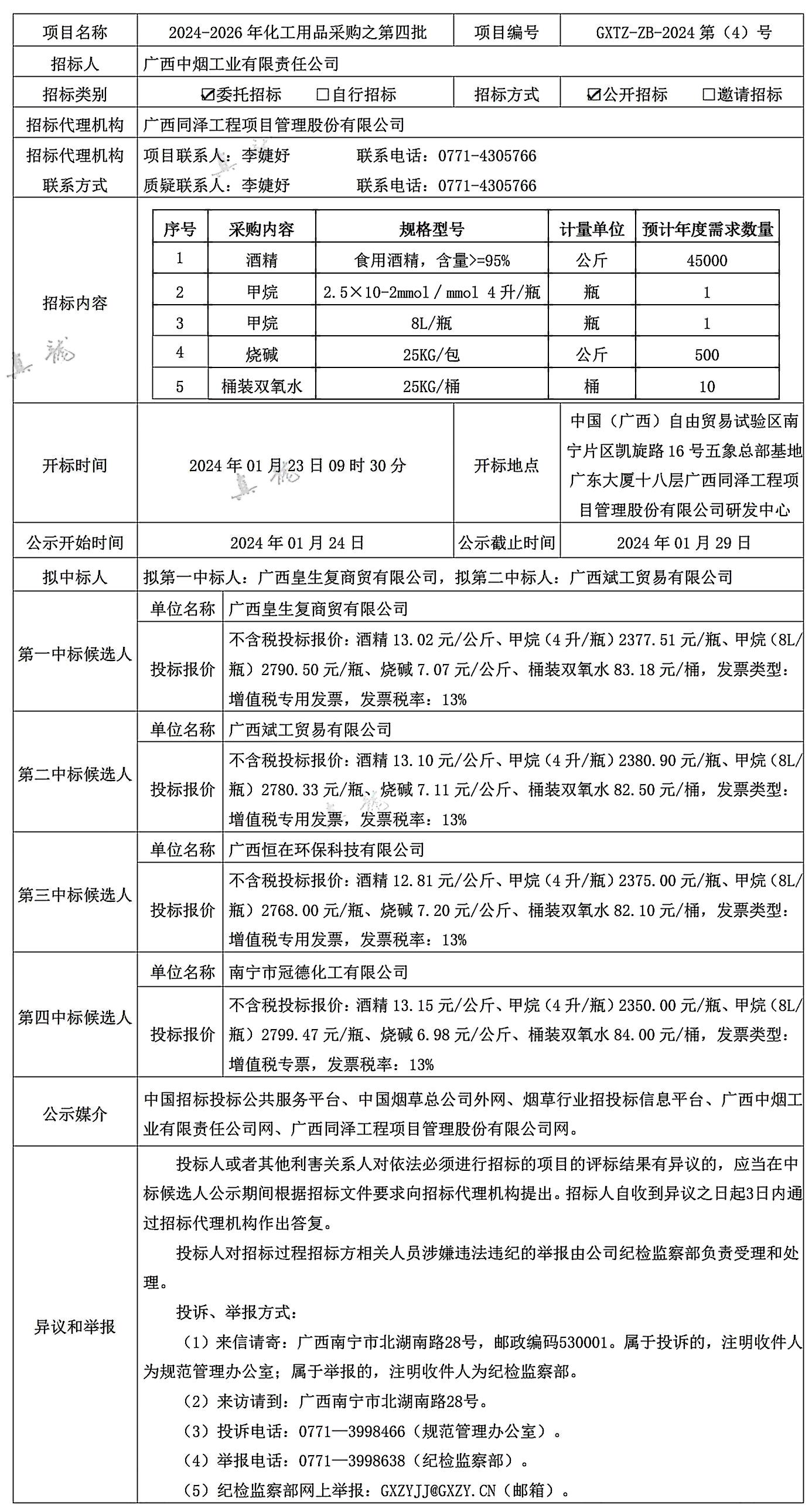 廣西中煙工業(yè)有限責任公司2024-2026年化工用品采購之第四批(項目編號:GXTZ-ZB-2024第(4)號)中標候選人公示